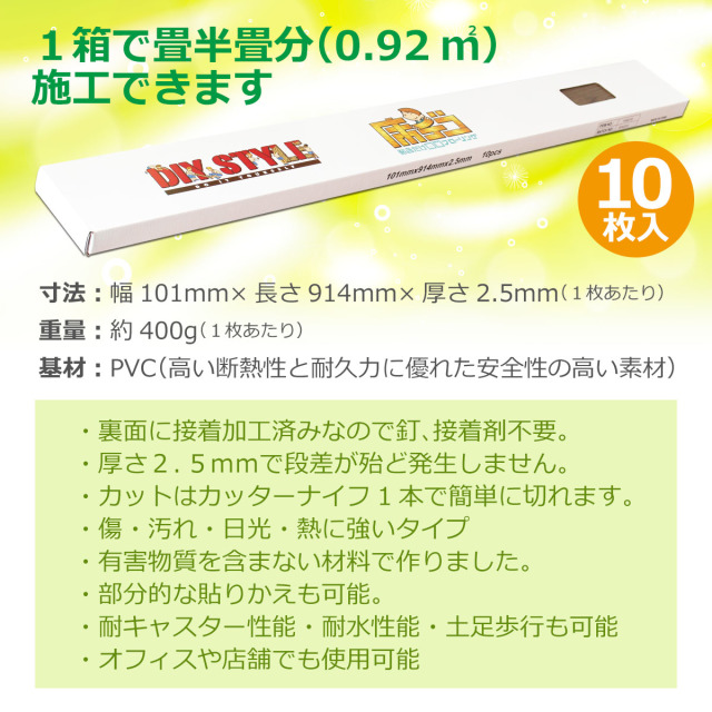 1箱(10枚入り)で畳半畳分(0.92平方メートル)施工できます
