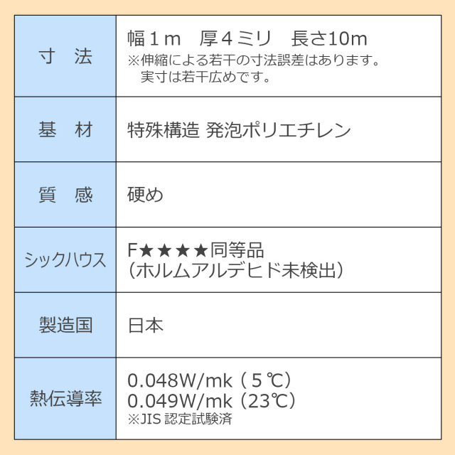 熱伝導率…0.0048W/mk(5℃) 0.049W/mk(23℃) ※JIS認定試験済